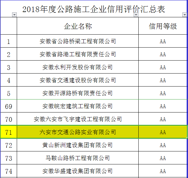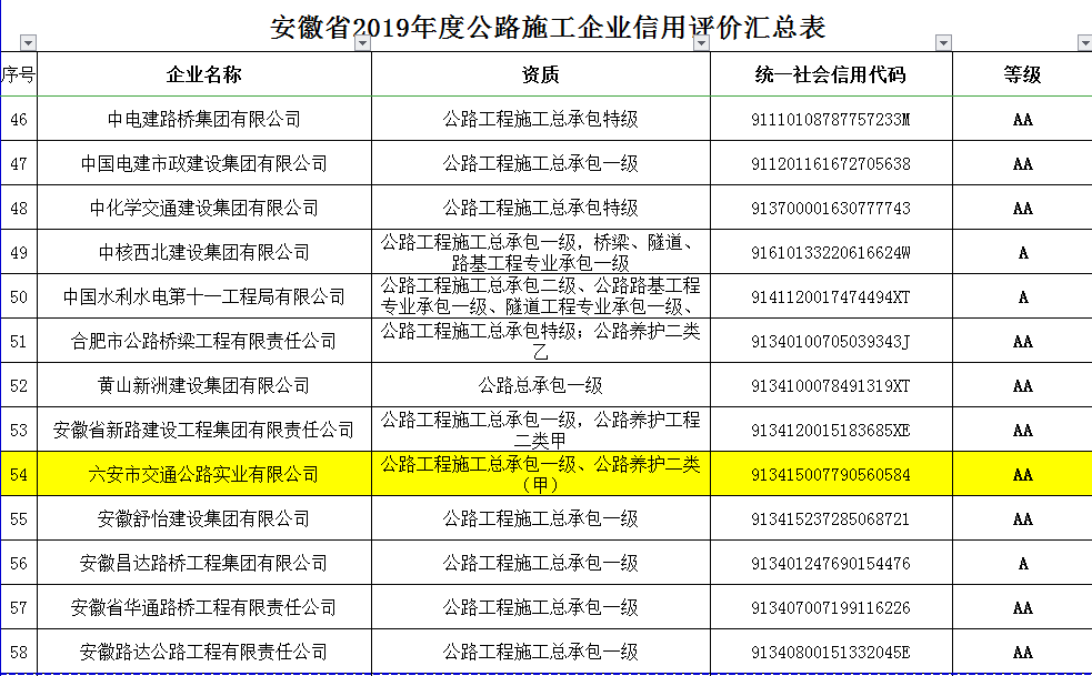 安徽省2016-2020年度安徽水運(yùn)單位信用評價(jià)-公路施工企業(yè)“AA”企業(yè)