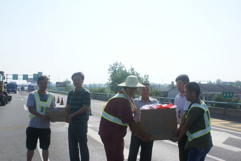 連日來,氣溫節(jié)節(jié)攀升,酷暑考驗(yàn)著堅(jiān)守在合六葉高速公路養(yǎng)護(hù)工程施工一線的職工。8月8日上午,公司領(lǐng)導(dǎo)及工會一行帶著毛巾、花露水、洗發(fā)液、香皂,急救藥箱及防暑降溫物品來到高速公路施工現(xiàn)場,親切慰問在烈日下仍辛勤地工作在工程施工最前線的一線職工??偨?jīng)理萬世林詢問了他們在高溫天氣下的工作、生活情況,叮囑職工在當(dāng)前持續(xù)高溫的不利條件下,安全做好工作的同時(shí),注意休息,勞逸結(jié)合,合理調(diào)整工作作息時(shí)間,采取有效的防暑措施,安全順利地度過高溫季節(jié),保質(zhì)保量的完成施工任務(wù)。