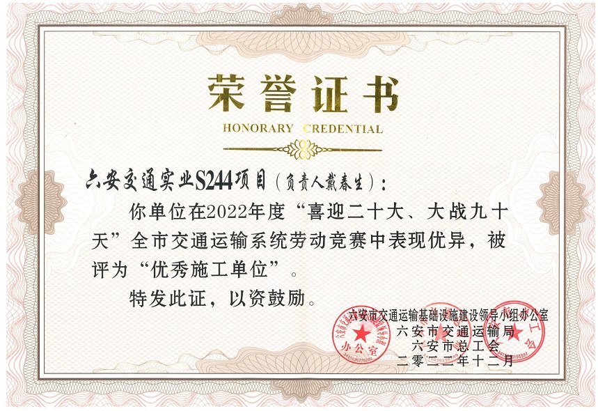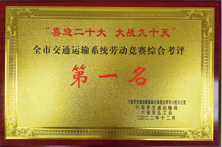 近日,公司在六安市交通運(yùn)輸局和六安市總工會組織的“喜迎二十大、大戰(zhàn)九十天”全市交通運(yùn)輸系統(tǒng)勞動競賽綜合考評中獲第一名。同時(shí)參與建設(shè)的S244羅崗至分路口段公路工程(二期)03合同段項(xiàng)目和G237六安馬頭至舒城萬佛湖工程(一期)項(xiàng)目在勞動競賽中被評為“優(yōu)秀施工單位”。